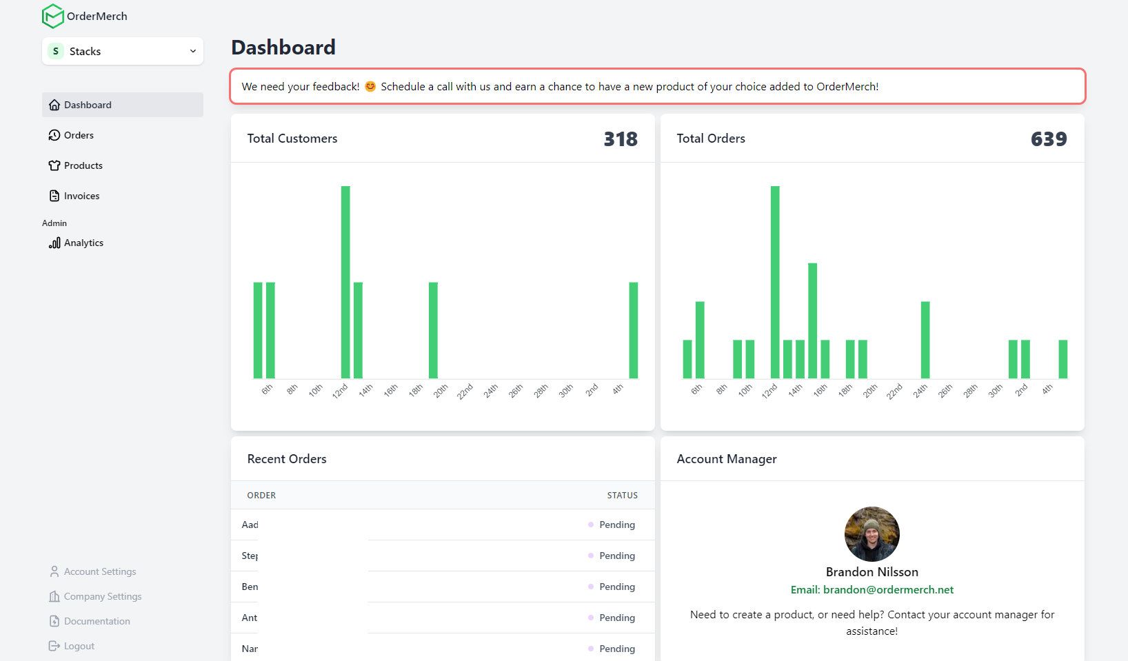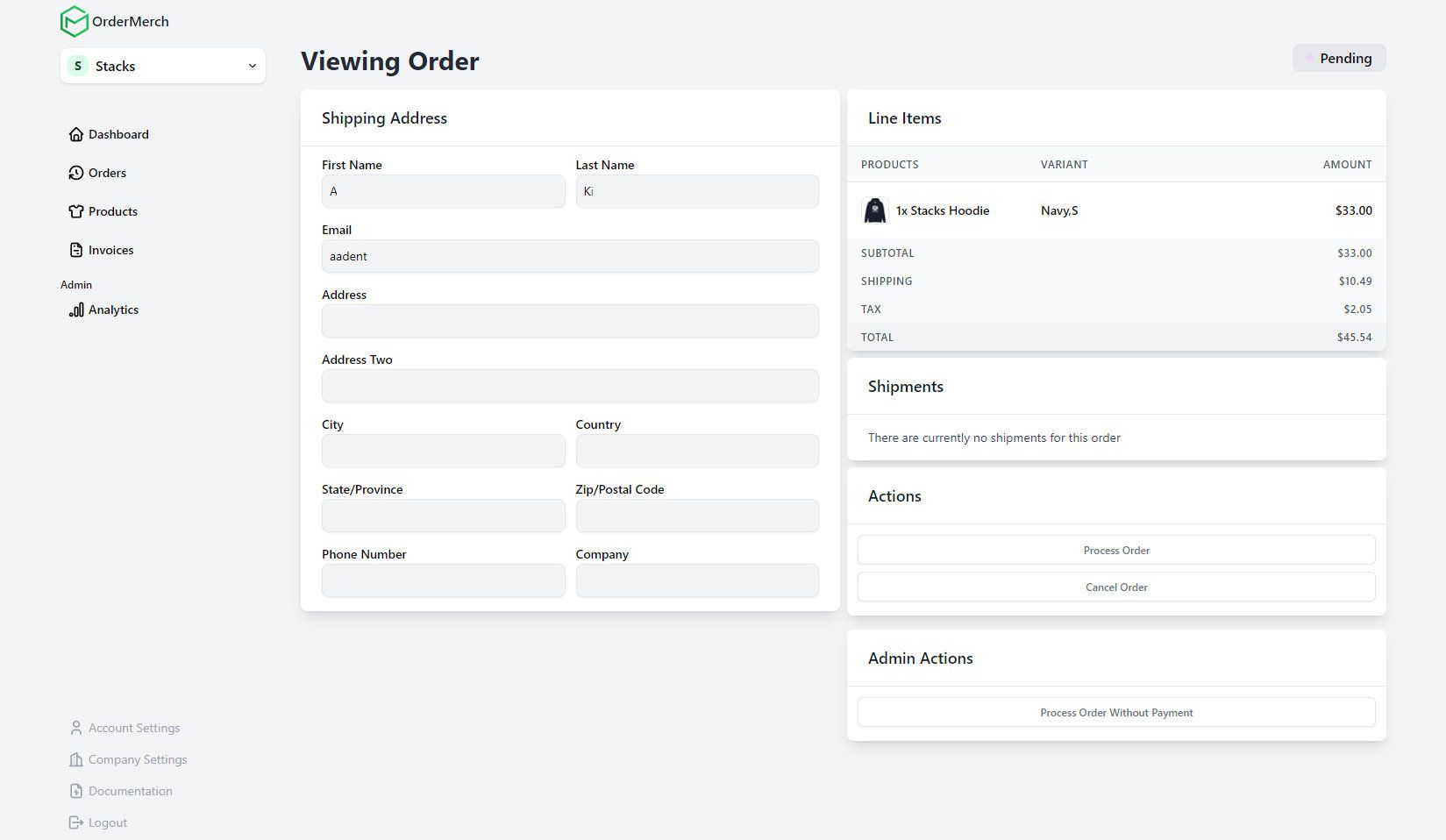 OrderMerch is a service I created and run by myself. The backend is created with Django and DRF. The front end uses Next.js and the app front end uses Sveltekit. The reason for separating the two is that Sveltekit works better with Fabricjs, which I started using for the designer. The service is mostly automated once a client is set up and integrated with the API. Merchandise is sent to and fulfilled by suppliers via rest APIs. I can provide snippets for the codebase upon request.